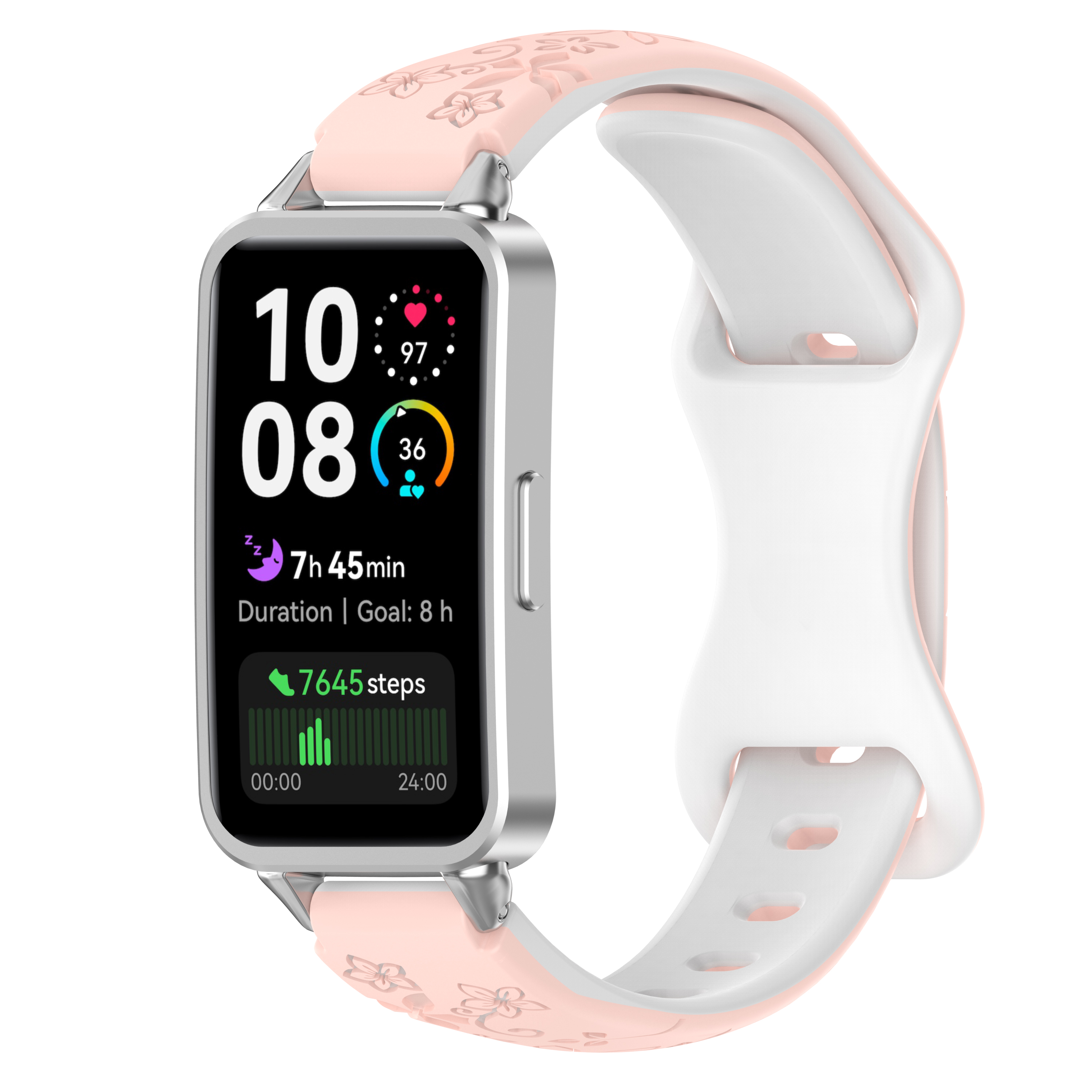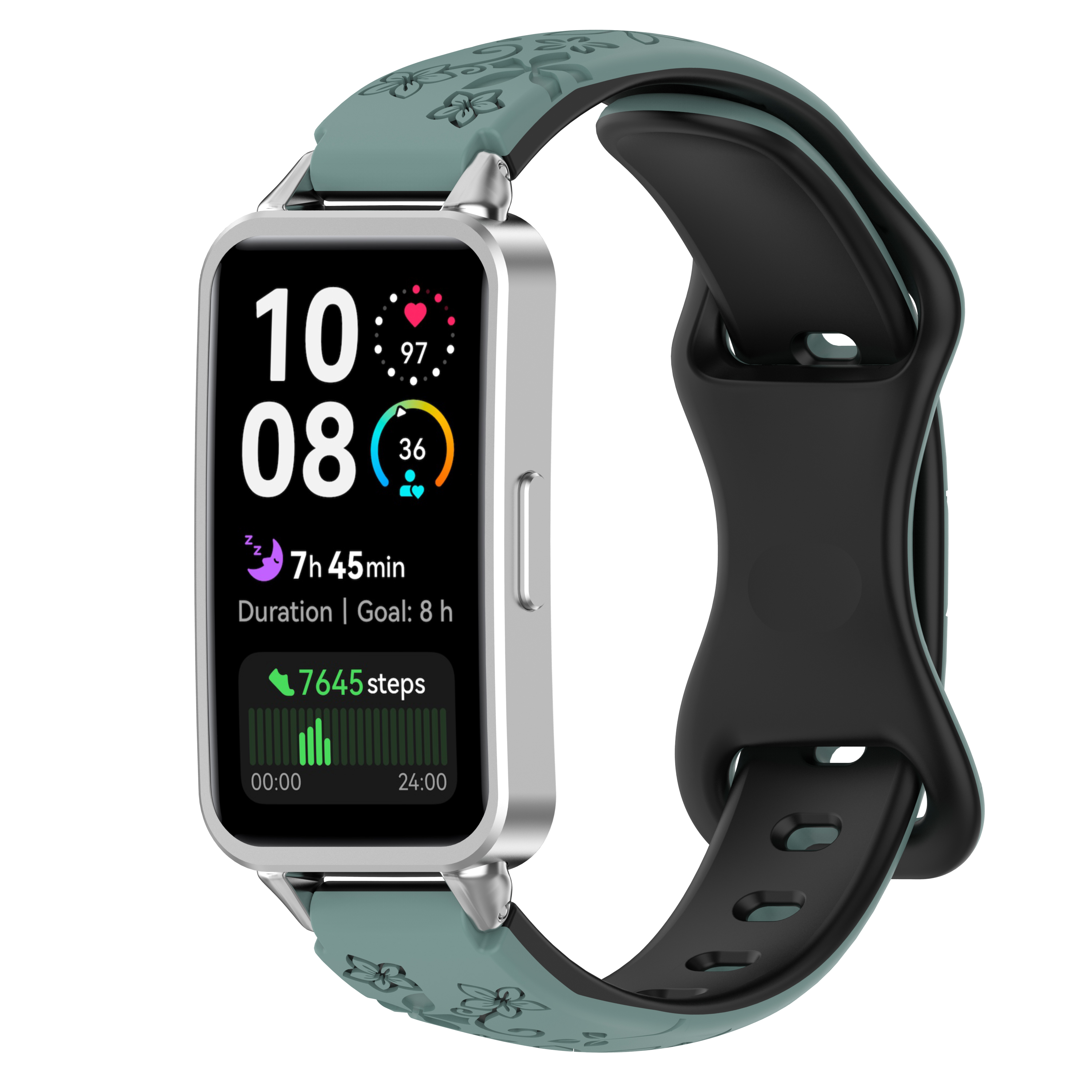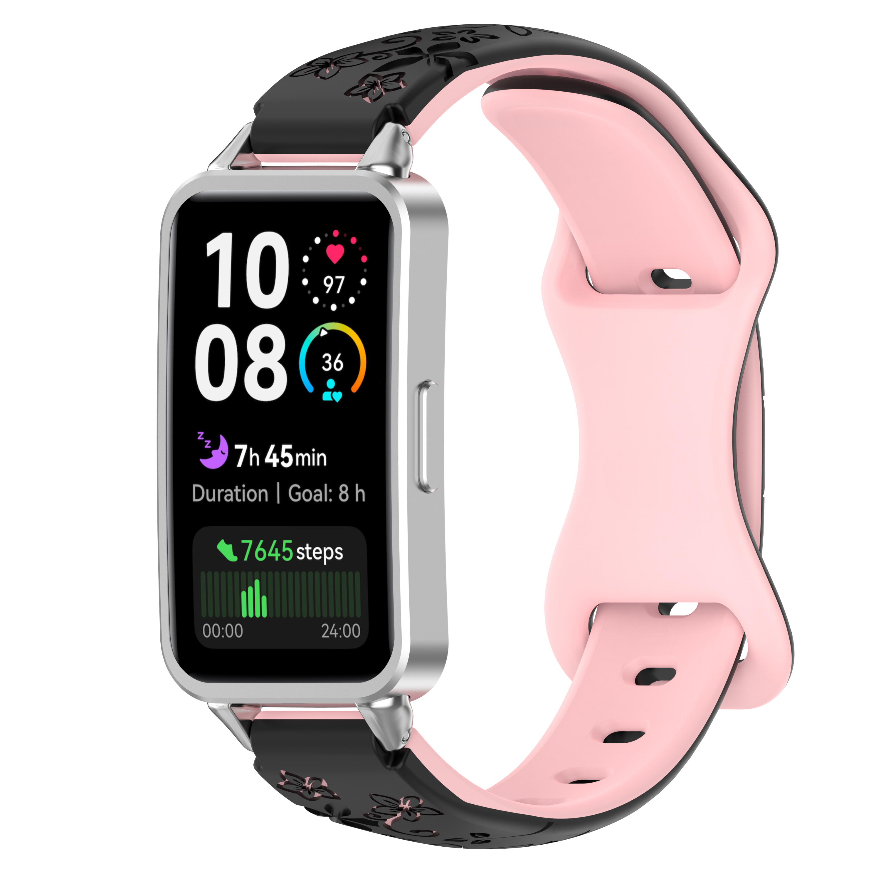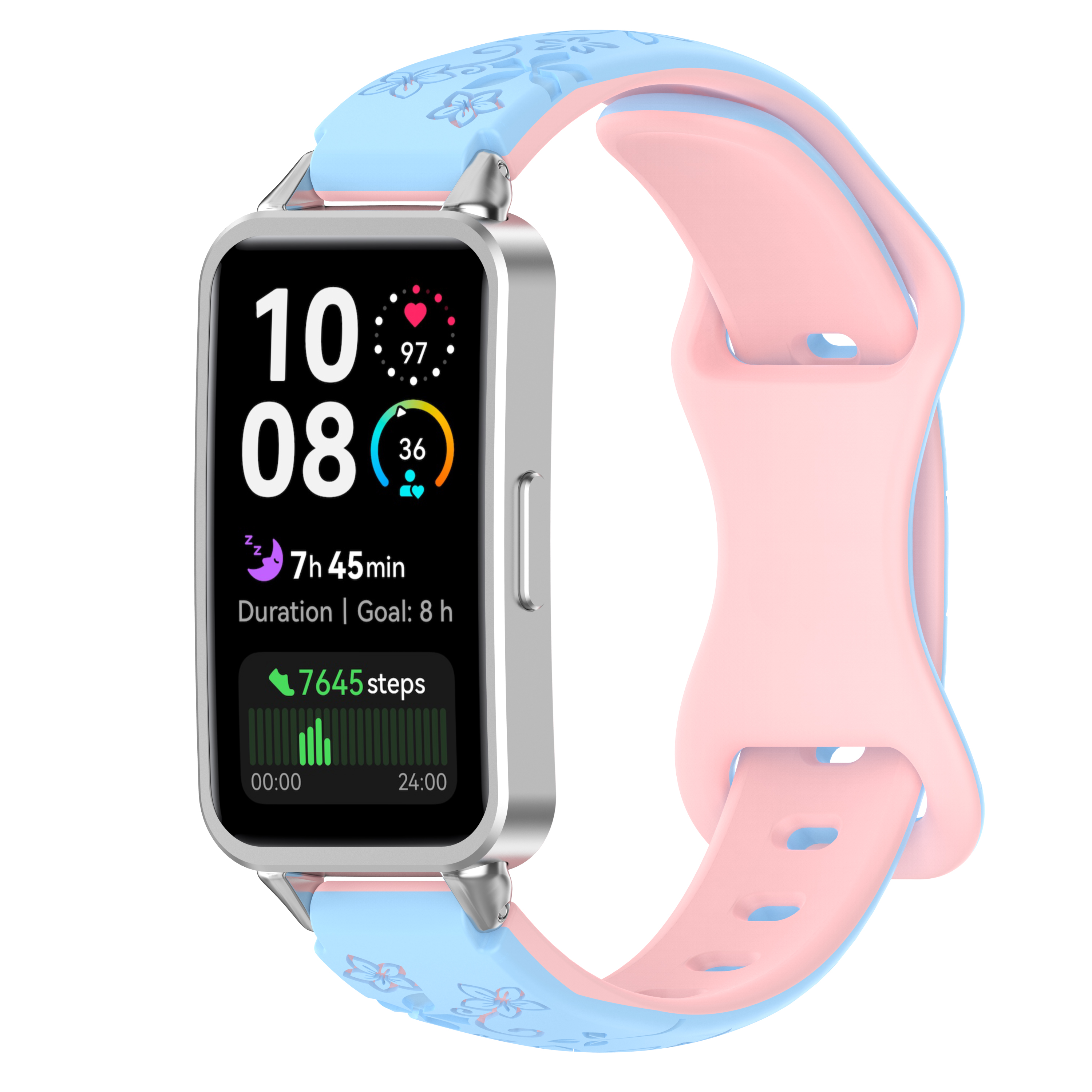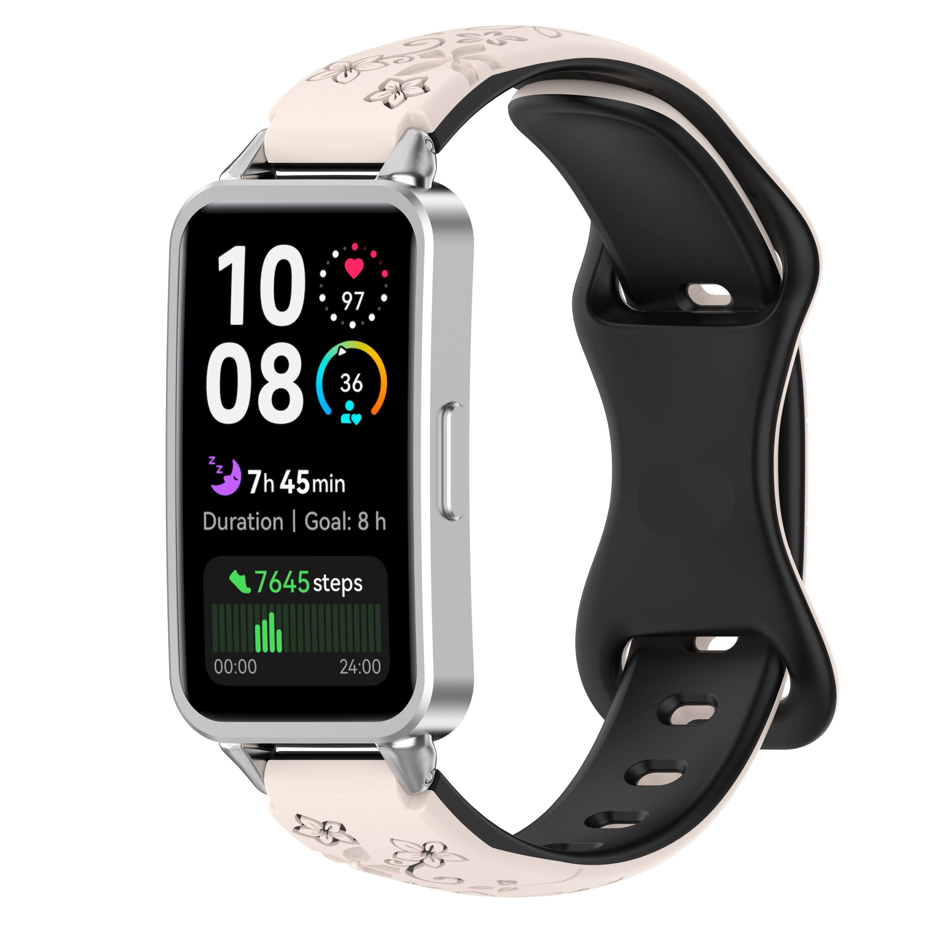 Изготовлен из гибкого и прочного силикона высокого качества, ремешок приятен на ощупь и не вызывает раздражения даже при длительном ношении. Двухцветная палитра добавляет стилевого акцента: один тон на внешнем слое, второй — на внутреннем, что позволяет менять настроение образа в зависимости от настроения или наряда. Рисунок на поверхности выполнен с учетом мелких деталей: он не стирается со временем, сохраняет яркость и чёткость под любым углом обзора. Такой дизайн особенно актуален для активного отдыха, походов в спортзал или городской суеты — ремешок сохраняет первоначальный вид даже после интенсивной тренировки.