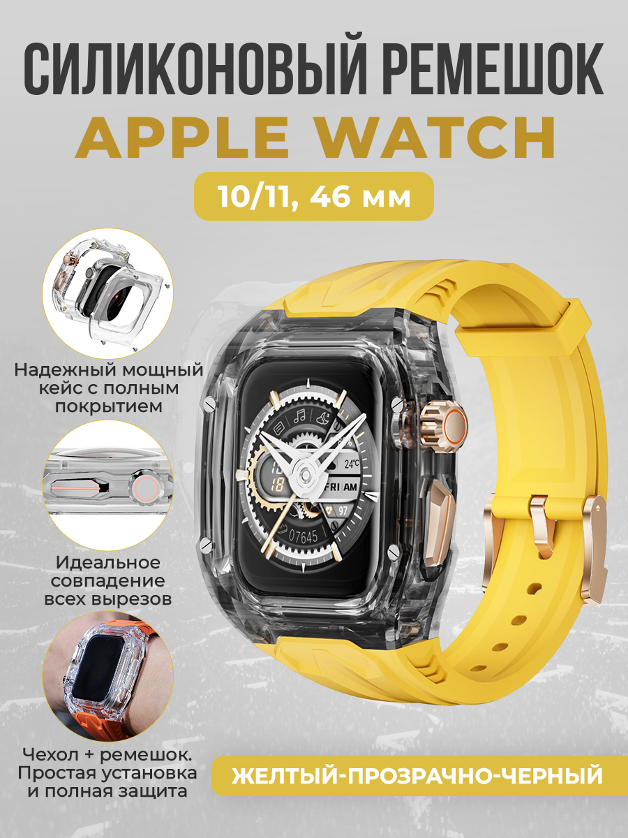 Силиконовый ремешок с бампером для Apple Watch 10/11, 46 мм, желтый-прозрачный-черный