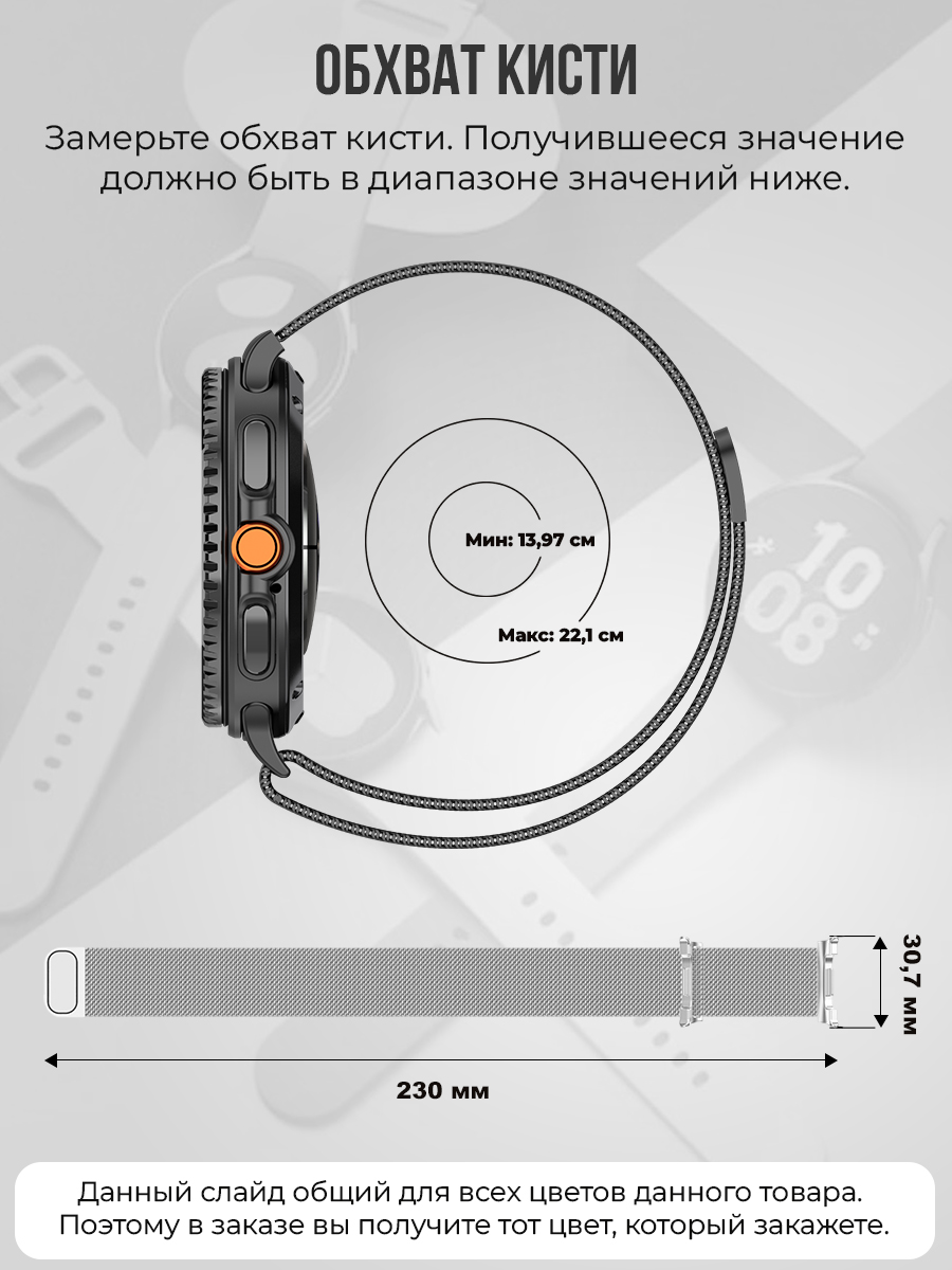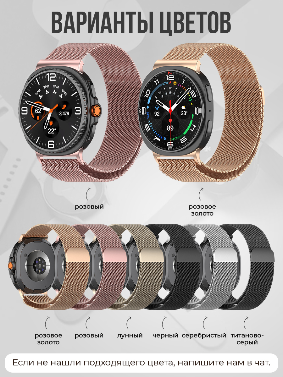Позвольте своим Самсунг гелекси вотч 8 или гелекси воч 8 классик выглядит более изысканно. Благодаря своему современному дизайну и минималистскому подходу, данный ремешок подойдет как для делового, так и для повседневного стиля. Узкие переплетения и блестящий металлический блеск привлекут внимание окружающих и подчеркнут ваш отличный вкус.Преимущества магнитного ремешка включают легкость в уходе и установке. Он легко крепится и снимается без особых усилий. Обновите свои Самсунг гелекси вотч 8 и гелекси воч 8 классик с помощью этого стильного и практичного аксессуара. Не упустите шанс сделать свои часы не только функциональными, но и эффектными. Закажите магнитный ремешок миланская петля прямо сейчас и наслаждайтесь качеством и стилем!