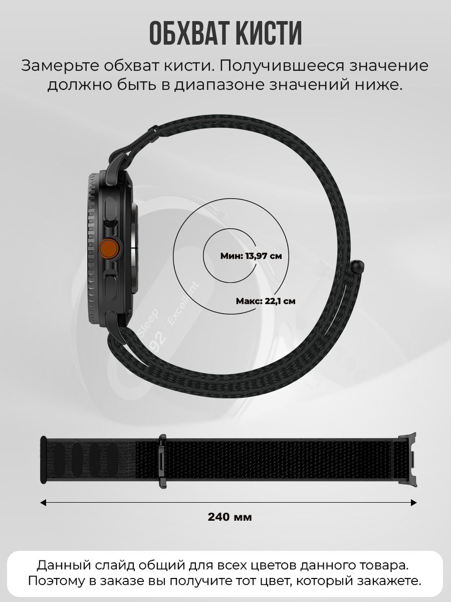 Преимущества на первом плане — это легкость и воздухопроницаемость. Нейлоновый ремешок обеспечивает отличную вентиляцию, минимизируя накопление влаги и запахов даже в жаркую погоду. Липучка надежно удерживает ремешок в нужной позиции, не соскальзывая во время бега, тренировки или повседневной работы за компьютером. Вы можете легко снять и надеть ремешок всего за несколько секунд, не требуя специальных инструментов. Это делает его идеальным выбором для тех, кто ценит скорость и удобство в повседневной жизни. Дизайн ремешка отличается минималистичной элегантностью с практичной стороны. Нейлоновая лента дополнена аккуратной плетенной структурой, которая не только выглядит стильно, но и выдерживает значительные механические нагрузки. Цвета и фактура ремешка гармонично сочетаются с корпусами часов Самсунг гелекси воч 8 и вотч 8 классик, подчеркивая их современный и технологичный характер. Благодаря нейтральной палитре ремешок подходит к любому стилю одежды — от спортивного до делового образа — и позволяет мгновенно менять образ без необходимости менять сам гаджет.