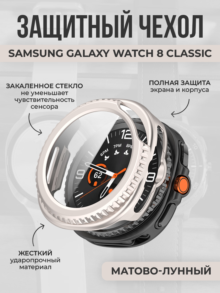 Жесткий защитный чехол со стеклом для Samsung Galaxy Watch 8 Classic, матово-лунный