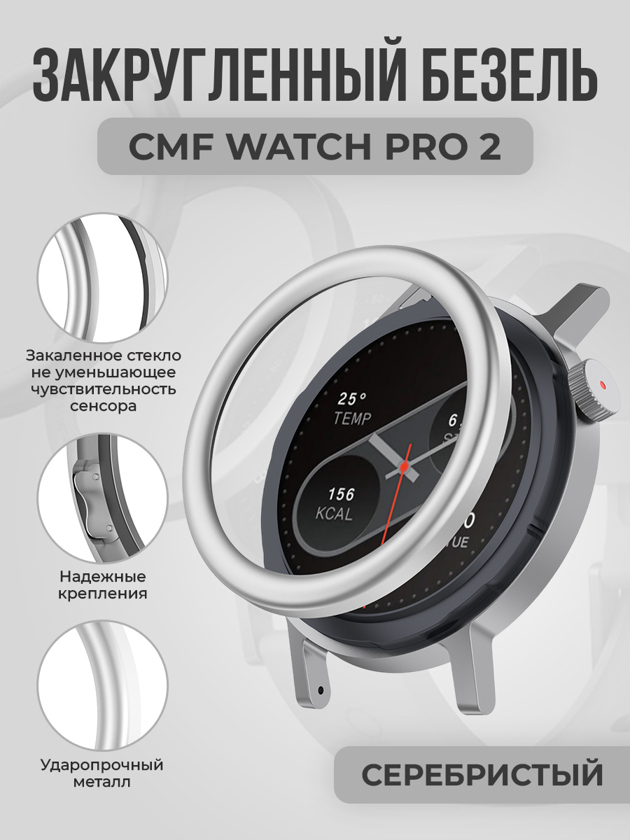 Металлический закругленный безель с защитным стеклом для CMF Watch Pro 2, серебристый