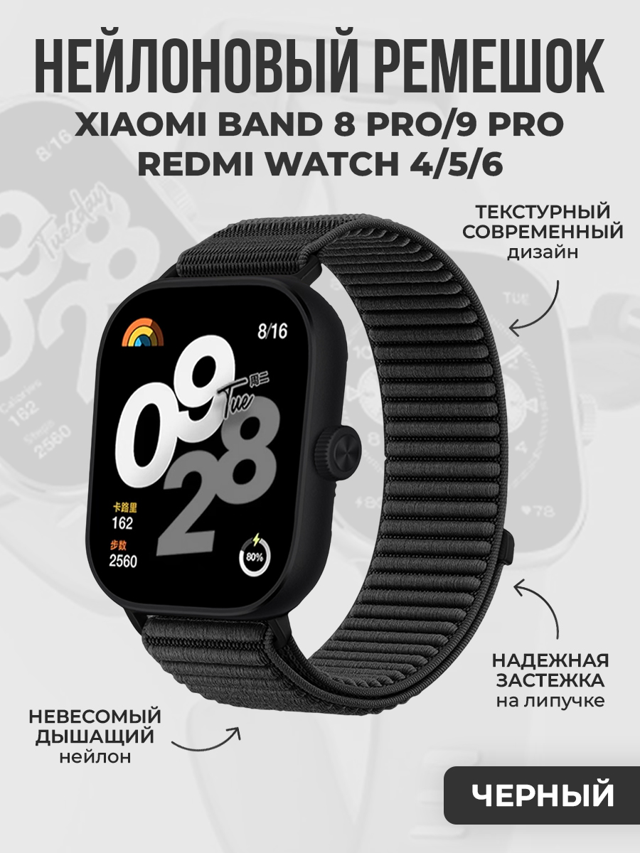Текстурный нейлоновый ремешок для Xiaomi Band 8 Pro/9 Pro/Redmi Watch 4/5/6, черный