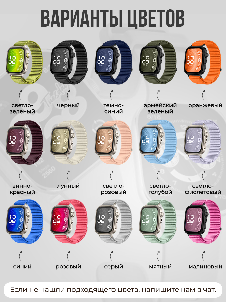 Нейлоновый материал обеспечивает отличный воздухообмен и минимизирует раздражение кожи во время длительного ношения. Широкая застежка-скобка и регулируемая длина позволяют подобрать идеальную посадку, обеспечивая стабильную фиксацию даже во время активных занятий спортом. Благодаря своей легкости ремешок практически не ощущается на запястье, что делает его идеальным выбором для тех, кто ценит комфорт и свободу движений.