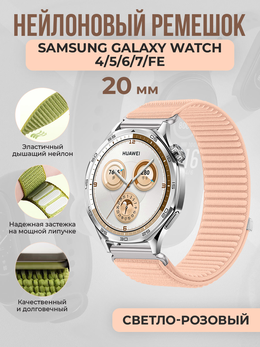 Универсальный нейлоновый ремешок для Samsung Galaxy Watch 4/5/6/7/FE, 20 мм, светло-розовый