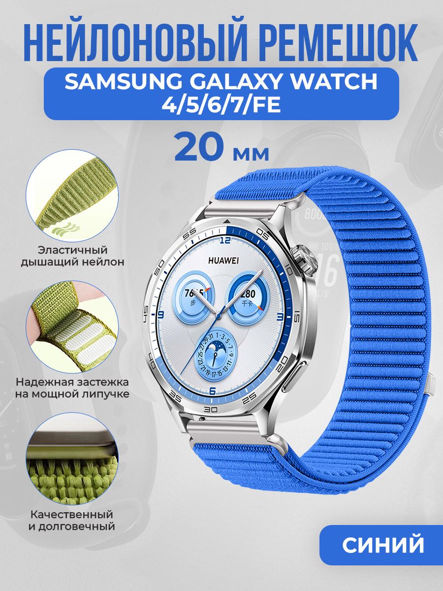 Универсальный нейлоновый ремешок для Samsung Galaxy Watch 4/5/6/7/FE, 20 мм, синий