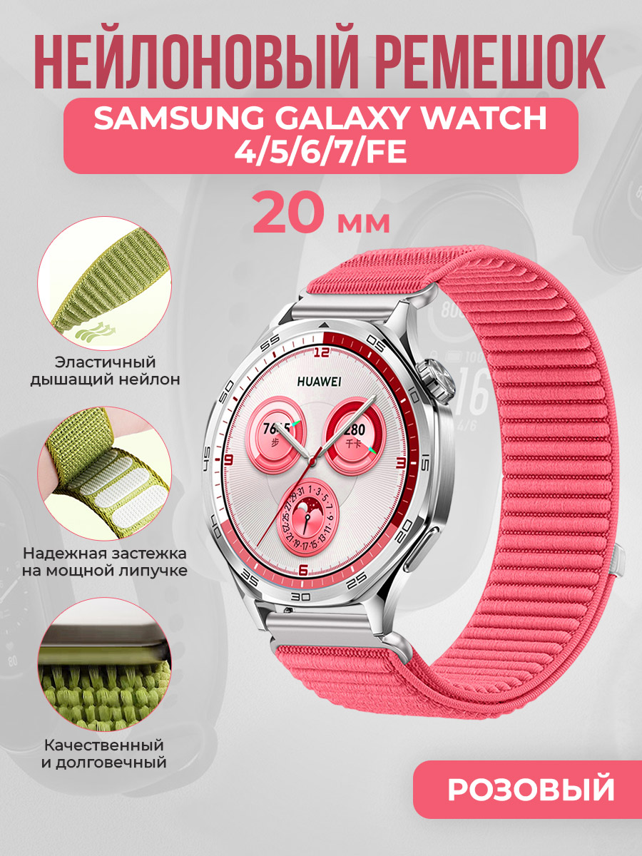 Универсальный нейлоновый ремешок для Samsung Galaxy Watch 4/5/6/7/FE, 20 мм, розовый