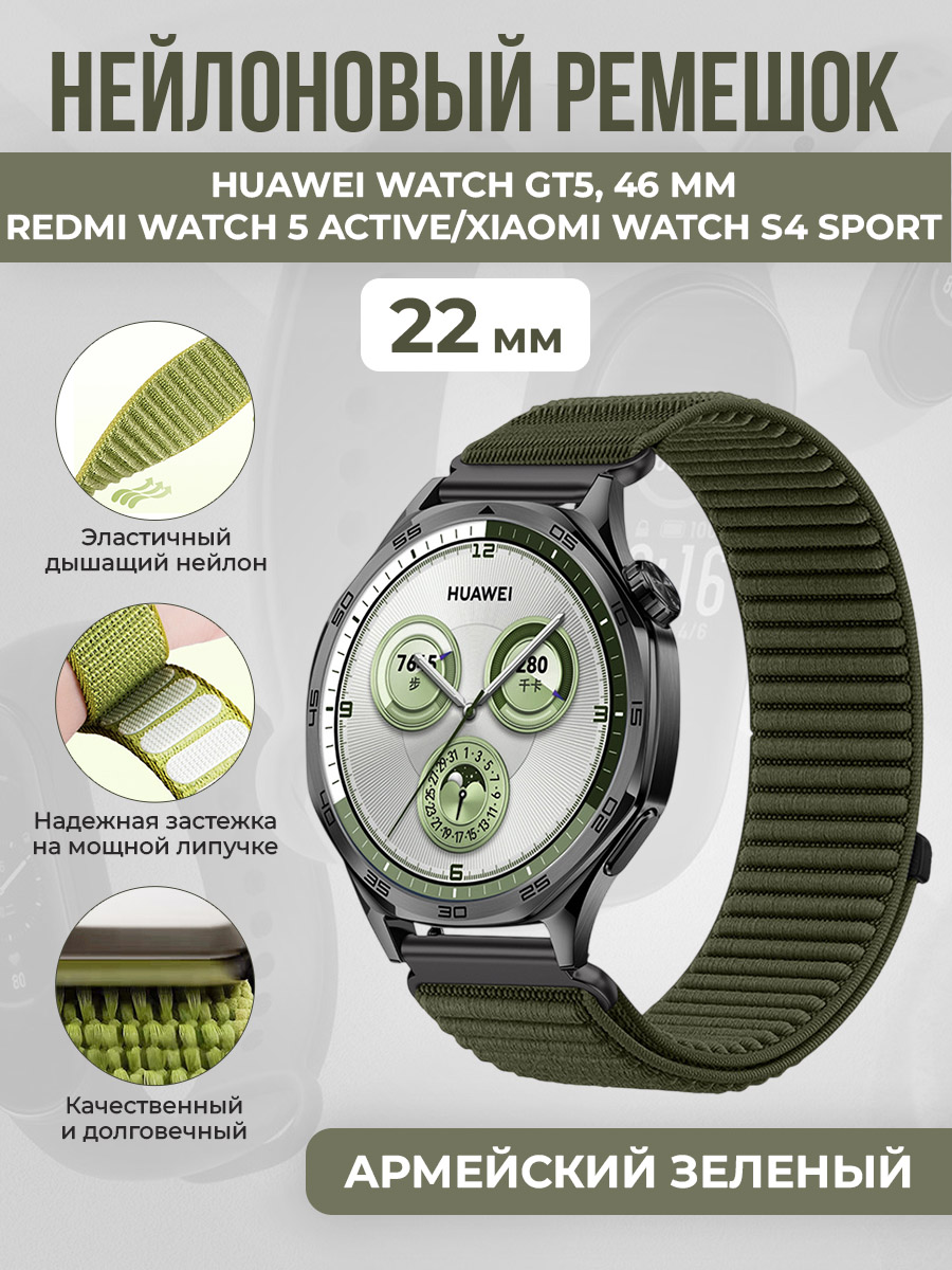 Нейлоновый ремешок для Huawei Watch GT5/Redmi Watch 5 Active/Xiaomi Watch S4 Sport, 22 мм, армейский зеленый