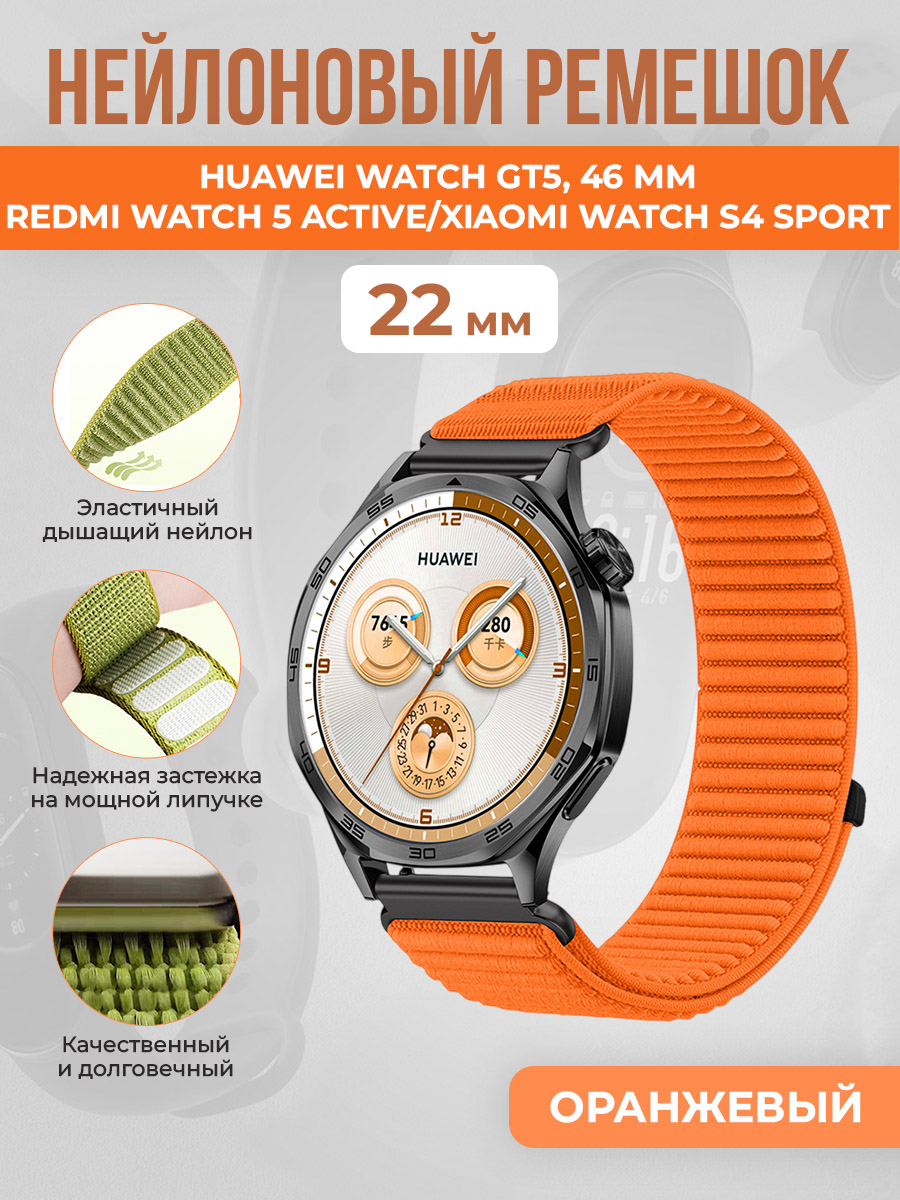 Нейлоновый ремешок для Huawei Watch GT5/Redmi Watch 5 Active/Xiaomi Watch S4 Sport, 22 мм, оранжевый