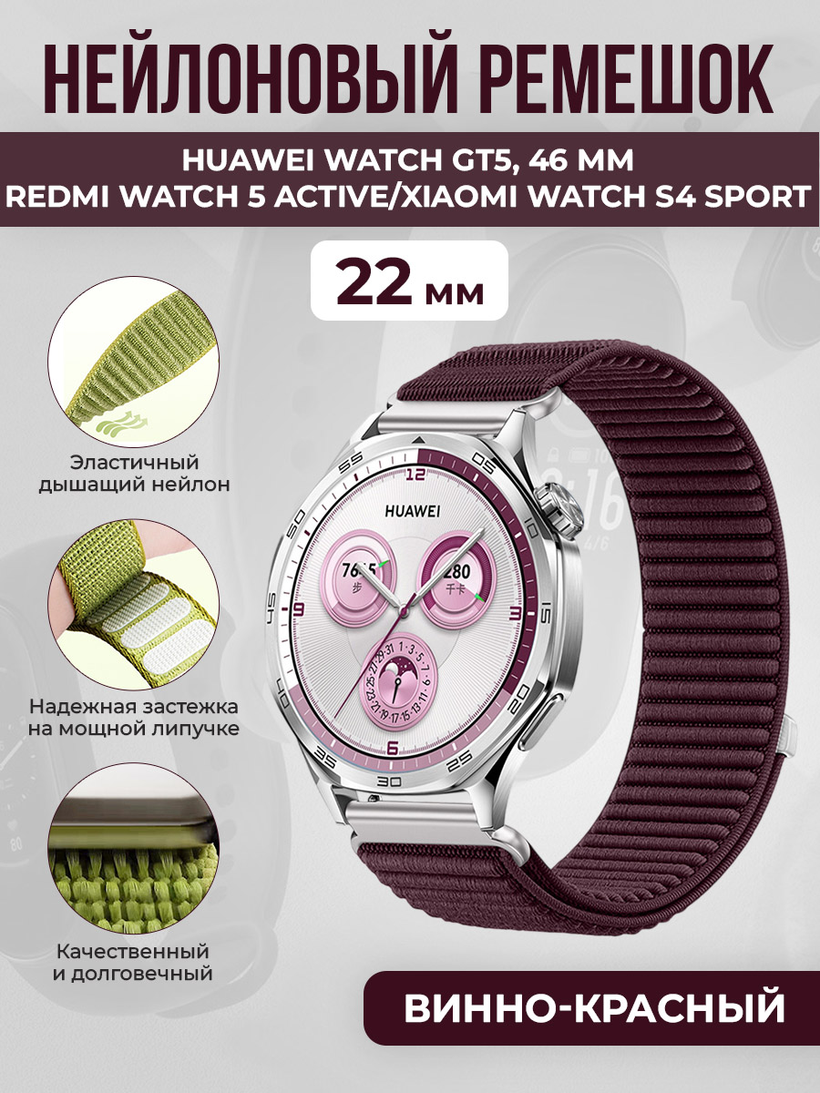 Нейлоновый ремешок для Huawei Watch GT5/Redmi Watch 5 Active/Xiaomi Watch S4 Sport, 22 мм, винно-красный