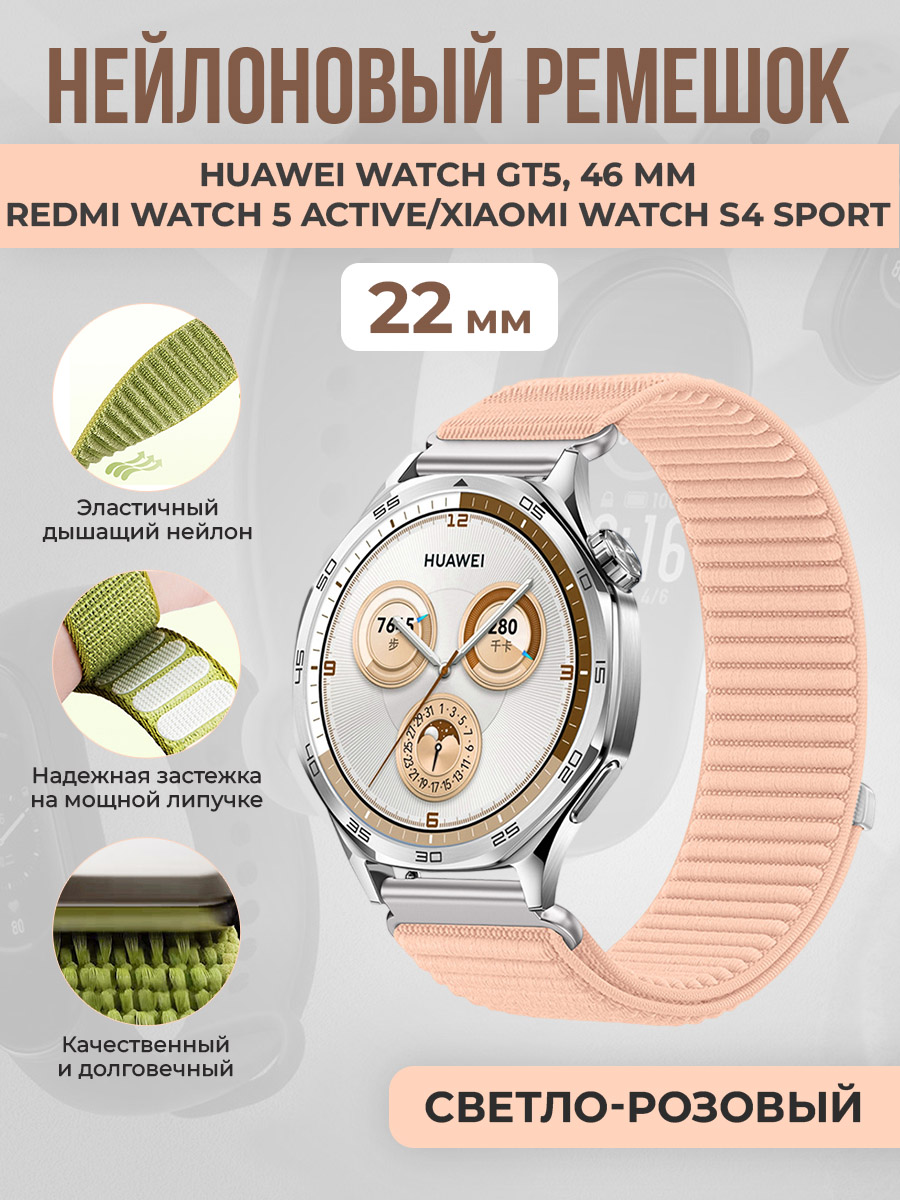 Нейлоновый ремешок для Huawei Watch GT5/Redmi Watch 5 Active/Xiaomi Watch S4 Sport, 22 мм, светло-розовый