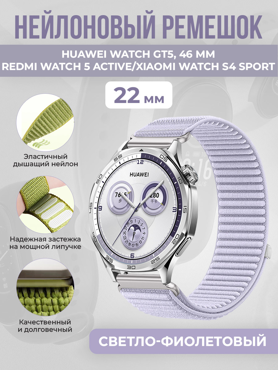 Нейлоновый ремешок для Huawei Watch GT5/Redmi Watch 5 Active/Xiaomi Watch S4 Sport, 22 мм, светло-фиолетовый