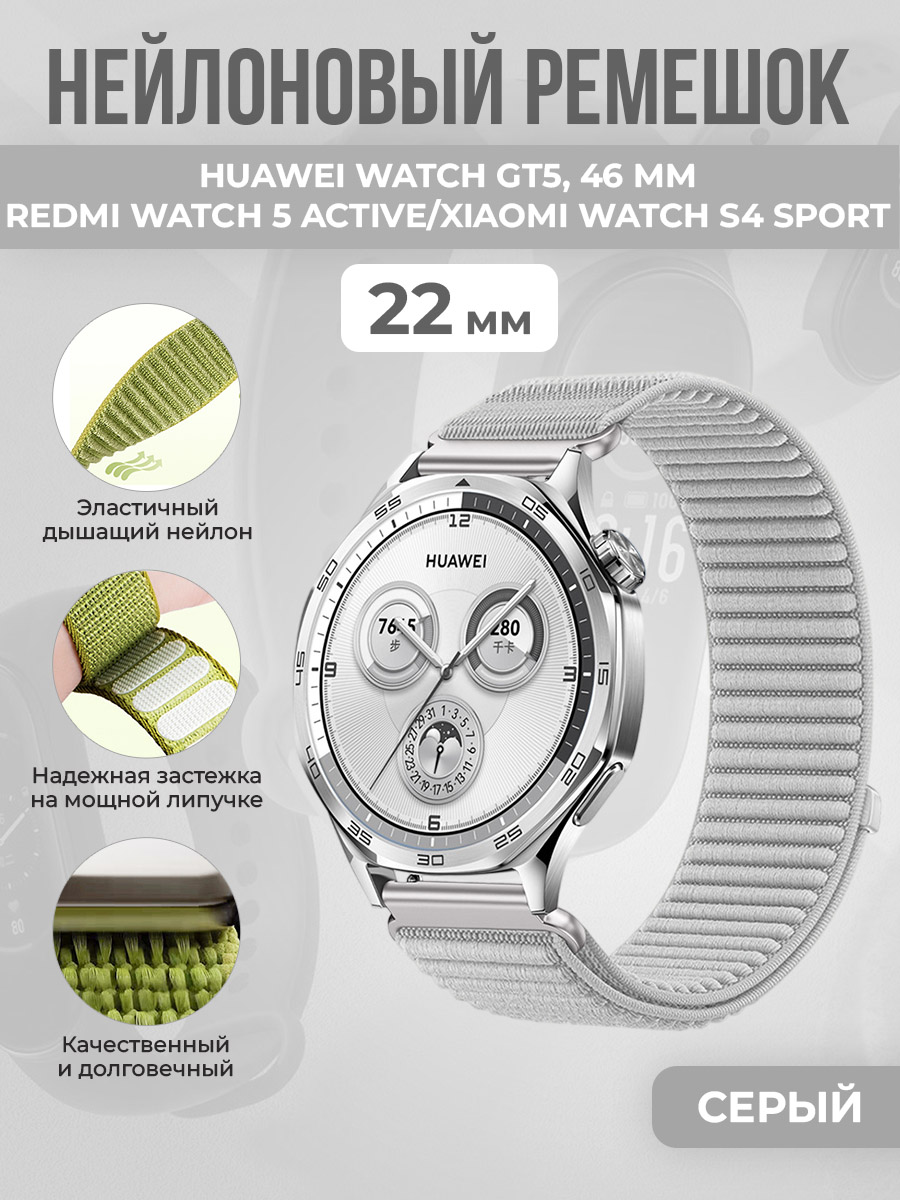 Нейлоновый ремешок для Huawei Watch GT5/Redmi Watch 5 Active/Xiaomi Watch S4 Sport, 22 мм, серый