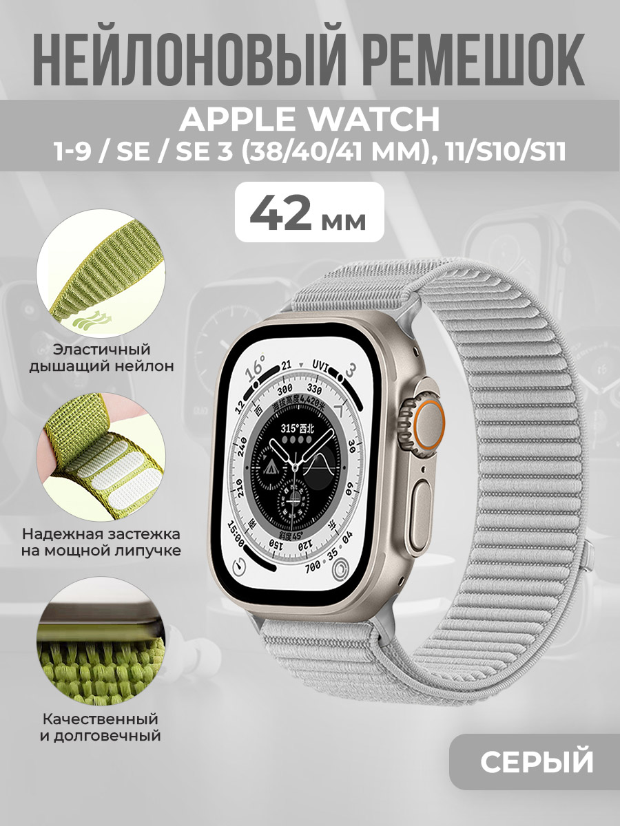Нейлоновый ремешок для Apple Watch 1-9 / SE / SE 3 (38/40/41 мм), 11/S10/S11, 42 мм, серый