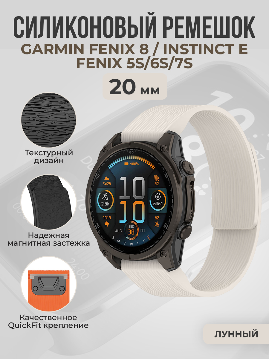 Магнитный силиконовый ремешок QuickFit для Garmin Fenix 8/Instinct E/Fenix 5S/6S/7S, 20 мм, лунный