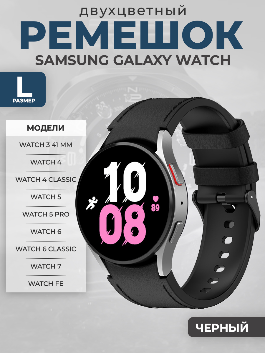 Двухцветный кожаный ремешок для Samsung Galaxy Watch 3/4/5/6/7/FE, размер L, черный, черная пряжка