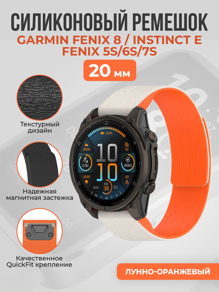 Ремешок имеет магнитный замок, который быстро и надежно фиксирует браслет на запястье, обеспечивает удобство надевания и снятия без необходимости ремешок подгонять по длине, сделан из мягкого силикона, который не натирает кожу и не теряет форму со временем, совместим с моделями Гармин Феникс 8, инстинкт E, феникс 5S, 6S и 7S с креплением 20 мм. Легко устанавливается и снимается без инструментов, устойчив к влаге и пыли, надежно держится во время активных занятий, легко чистится под проточной водой и с мылом, сохраняет яркость цветов и не выцветает при регулярном использовании. Идеально подходит для занятий спортом на свежем воздухе и для повседневной носки, обеспечивает стильный акцент к любому образу, подходит для мужчин и женщин, имеет современный дизайн и широкую совместимость, оптимально сочетает в себе комфорт, практичность и долговечность,
