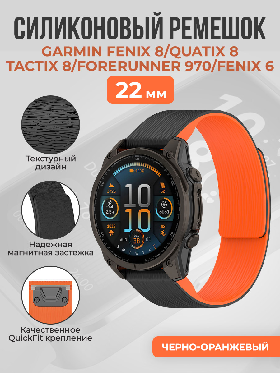 Силиконовый ремешок QuickFit для Garmin Fenix 8/Quatix 8/Tactix 8/Forerunner 970/Fenix 6, 22мм, черно-оранжевый