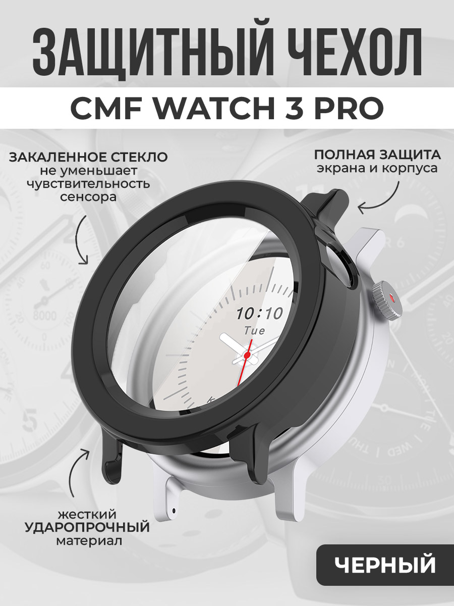 Жесткий защитный чехол со стеклом для CMF Watch 3 Pro, черный