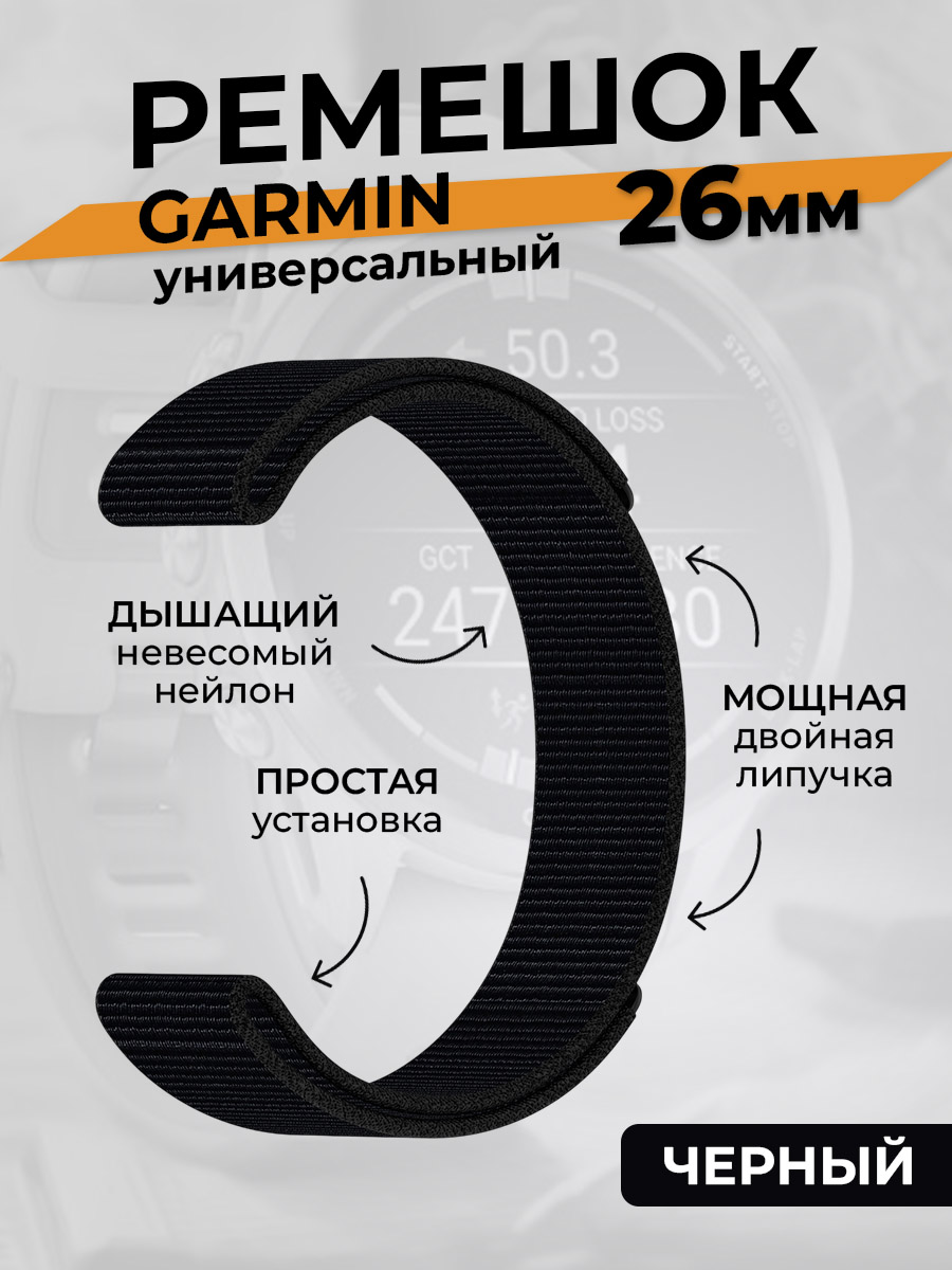 Универсальный нейлоновый ремешок на липучке для Garmin, 26 мм, черный