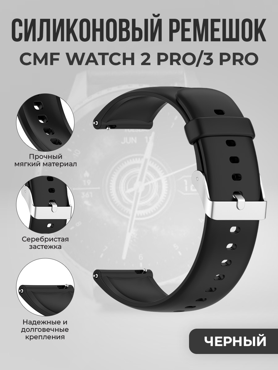 Универсальный силиконовый ремешок с серебристой застежкой для CMF Watch 2 Pro/3 Pro , черный
