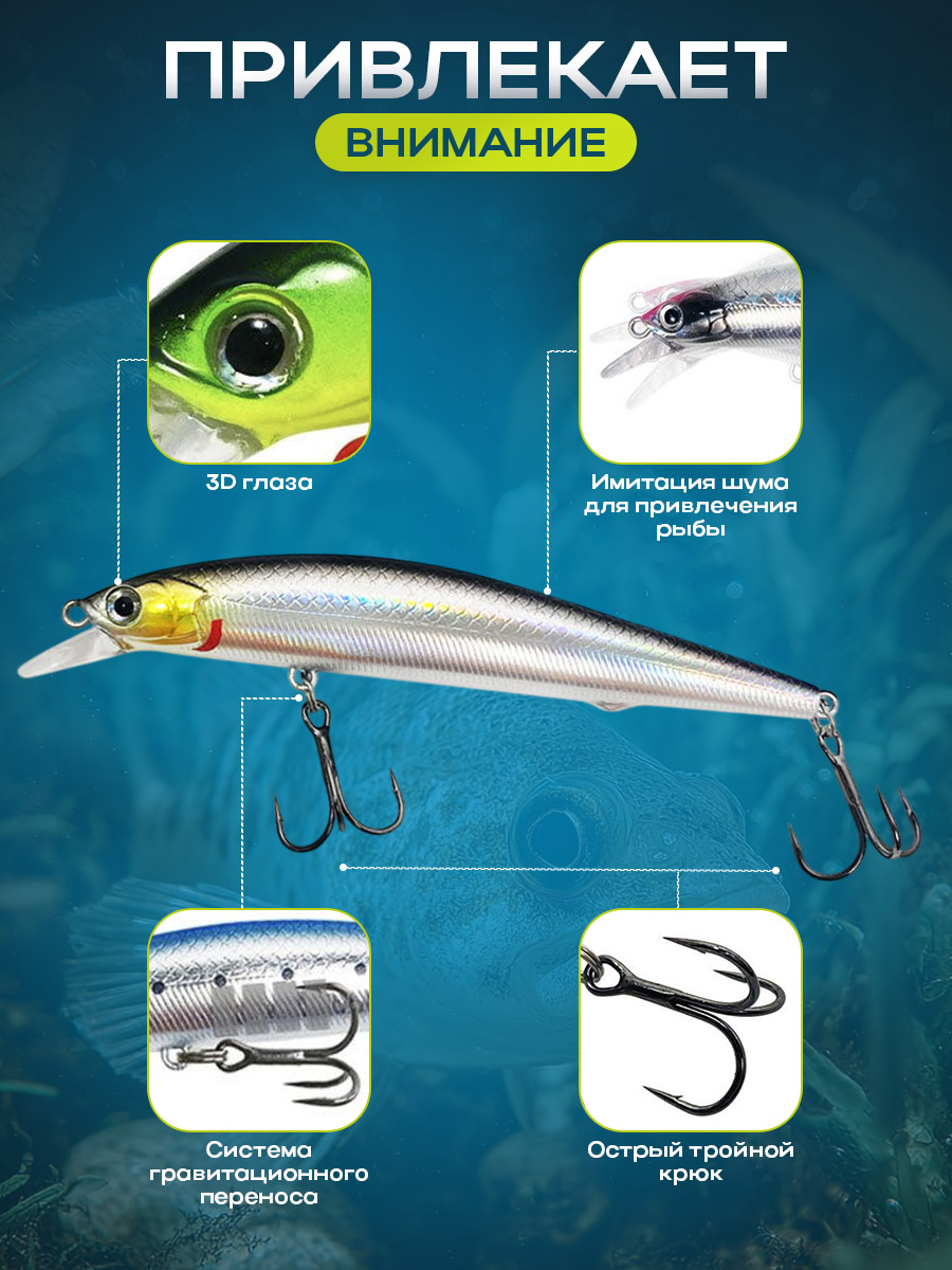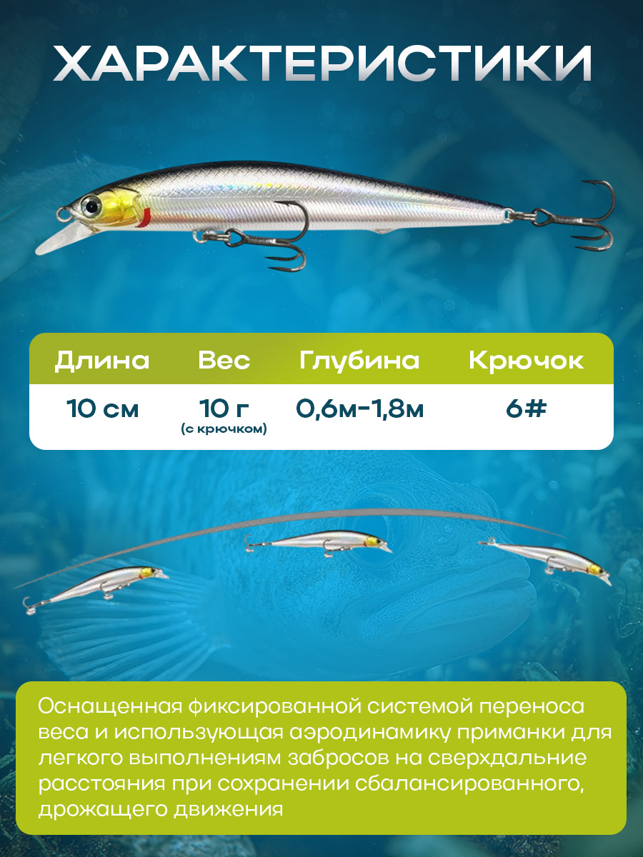 Рыболовная приманка "Минноу" — для дальнего заброса, суспендинговые, минноу, с системой утяжеления и тройными крючками для окуня и верблюда-арапуса, 10 см/10 г представляют собой современное решение для противостояния любым условиям водоема и достижения максимальной результативности на рыбалке. Эта приманка рассчитана на дальний заброс и стабильную игру на протяжении всей проводки, что делает ее незаменимым инструментом как для опытных рыболовов, так и для начинающих, стремящихся освоить технику ловли на минноу с эффективной глубинной постановкой. В основе конструкции лежит продуманная система утяжеления, которая обеспечивает идеальное соотношение объемной плавучести и массы, позволяя маневрировать приманкой на заданной глубине даже при сильном течении и ветре. Благодаря суспендинговой характеристике приманка занимает нейтральное положение в воде между поверхностью и донной частью водоема, что позволяет максимально естественно повторять игру раненой или раненой добычи и привлекать внимание рыбы с разных уровней вертикали.