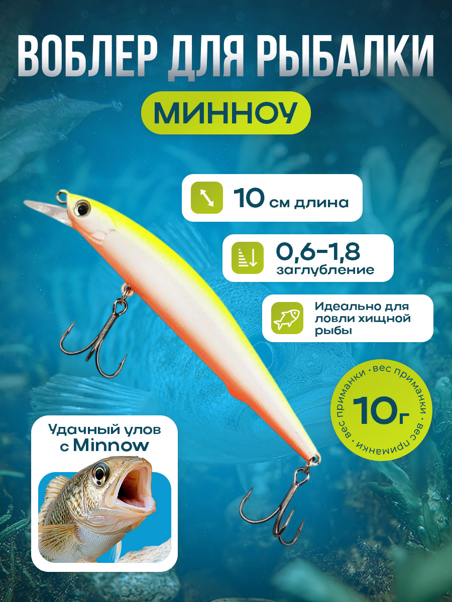 Рыболовная приманка "Минноу" — для дальнего заброса, суспендинговые, минноу, с системой утяжеления и тройными крючками для окуня и верблюда-арапуса, 10 см/10 г представляют собой современное решение для противостояния любым условиям водоема и достижения максимальной результативности на рыбалке. Эта приманка рассчитана на дальний заброс и стабильную игру на протяжении всей проводки, что делает ее незаменимым инструментом как для опытных рыболовов, так и для начинающих, стремящихся освоить технику ловли на минноу с эффективной глубинной постановкой. В основе конструкции лежит продуманная система утяжеления, которая обеспечивает идеальное соотношение объемной плавучести и массы, позволяя маневрировать приманкой на заданной глубине даже при сильном течении и ветре. Благодаря суспендинговой характеристике приманка занимает нейтральное положение в воде между поверхностью и донной частью водоема, что позволяет максимально естественно повторять игру раненой или раненой добычи и привлекать внимание рыбы с разных уровней вертикали.