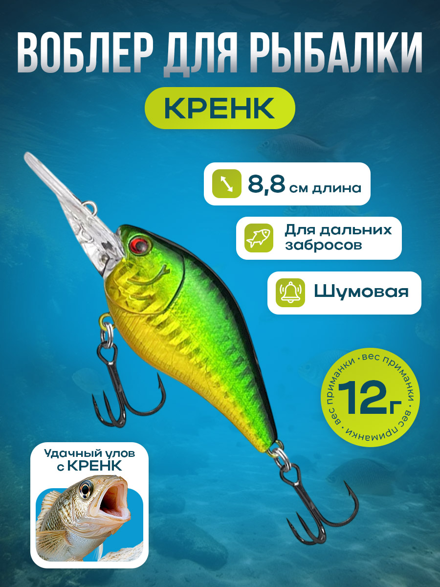 Большая толстая плавающая приманка Кренкбейт (Crankbait) / Фэт-кренк (Fat Crank / Squarebill Crank) с длинной губой, твердая приманка с погремушкой, 8,8 см, 12 г класса "Плавающие (floating) - F" — это универсальный инструмент для ловли крупной хищной рыбы на разных водоемах. Сочетание крупных габаритов и яркой внешности делает ее заметной на дальних дистанциях, обеспечивая уверенный вход в зону поклевки и высокую вероятность успешной проводки. Данная приманка создана для тех рыболовов, которые ценят надежность, универсальность и эффективную игру в воде. Твердый корпус приманки из прочного пластика выдерживает частые контакты с дном, водорослями и корягами, сохраняя форму и цвет на протяжении многих вываживаний. Гуртовая длина 8,8 см обеспечивает заметную презентацию на воде и привлекает внимание хищников с дальних дистанций. Внутренний погремушечный элемент добавляет характерный акустический сигнал, усиливая привлекательность приманки в мутной воде, при слабом течении или ночью. Встроенная длинная губа оптимизирует угол атаки и ускорение передней части приманки, способствуя глубокой и эффективной проводке даже при умеренном забросе.