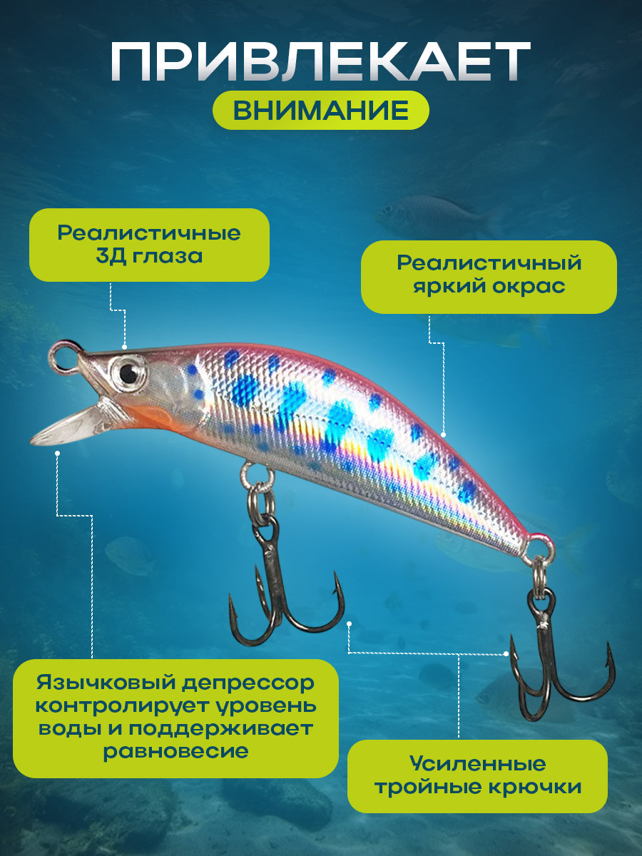 Гольяноподобная форма приманки выбрана не случайно: компактные размеры и обтекаемая геометрия снижают сопротивление воды и позволяют приманке достигать рабочих слоёв океана быстрее и с меньшими усилиями. Длина 5,6 см делает ее заметной на фоне равномерной подводной массы, в то же время она остается достаточно незаметной для рыбы, что особенно важно в условиях морских глубин и резких перепадов температуры воды. Вес около 5 г под стать габаритам обеспечивает устойчивое и предсказуемое поведение приманки при дальних забросах.