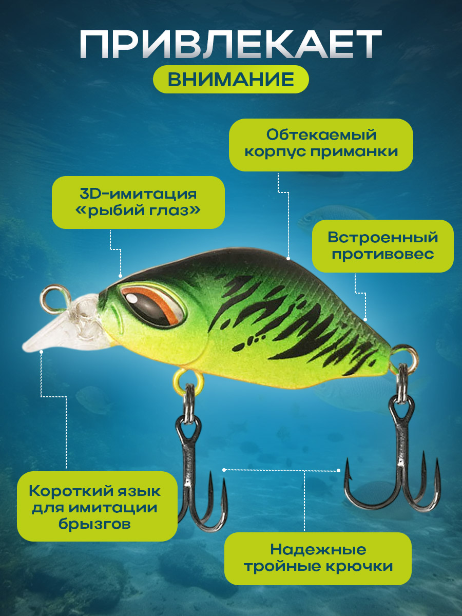 Цветная приманка класса "Тонущие (sinking) - S" в виде мелкого толстого Фэт (Fat) с большим глазом и тройными крючками — это универсальный инструмент для ловли окуня и других хищников на малых и средних горизонтах водоема. Размеры 4,2 см и вес 3,5 г делают её крайне манёвренной и чувствительной к минимальным движениям приманочный панель. Толстый профиль Фэта обеспечивает стабильное положение во время проводки и позволяет приманке хорошо держаться на течении, а плавная игра тела создаёт естественную траекторию траекторию, которая провоцирует агрессивную атаку хищника. Большой глаз служит не только декоративной деталью, но и визуальным ориентиром для рыбы: глаз притягивает внимание и усиливает иллюзию живой добычи, особенно в условиях сумерек или мутной воды, когда зрительная ориентация играет важную роль. Материалы приманки подобраны так, чтобы сочетать прочность и гибкость: форма и текстура поверхности отражают свет под разными углами, создавая естественный блеск и бликовые всплески, напоминающие настоящего мелкого тунца или малька.
