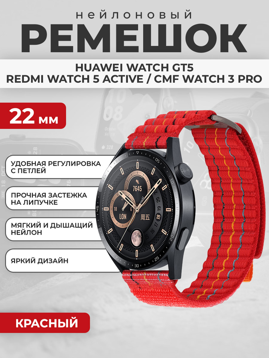 Нейлоновый ремешок для Huawei Watch GT5/Redmi Watch 5 Active/CMF Watch 3 Pro, 22 мм, красный