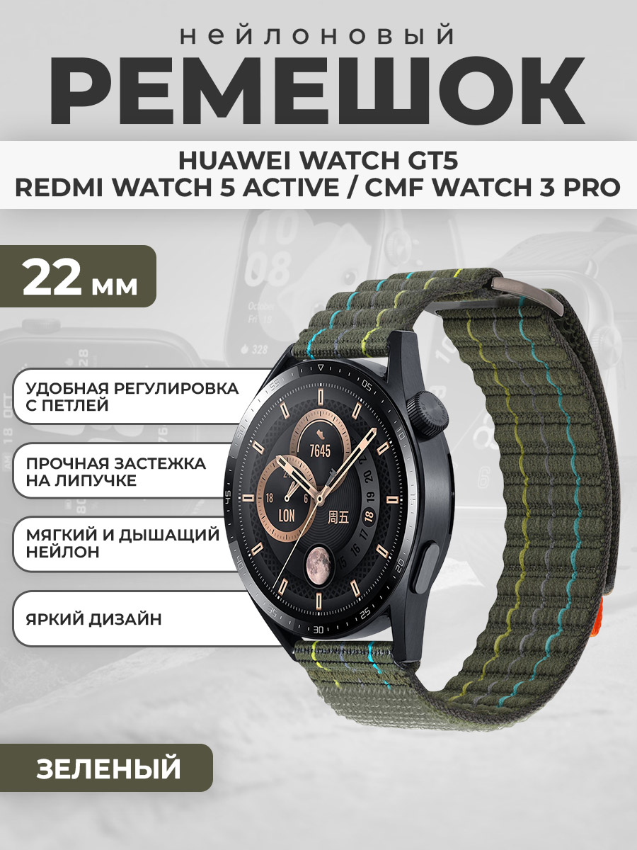 Нейлоновый ремешок для Huawei Watch GT5/Redmi Watch 5 Active/CMF Watch 3 Pro, 22 мм, зеленый