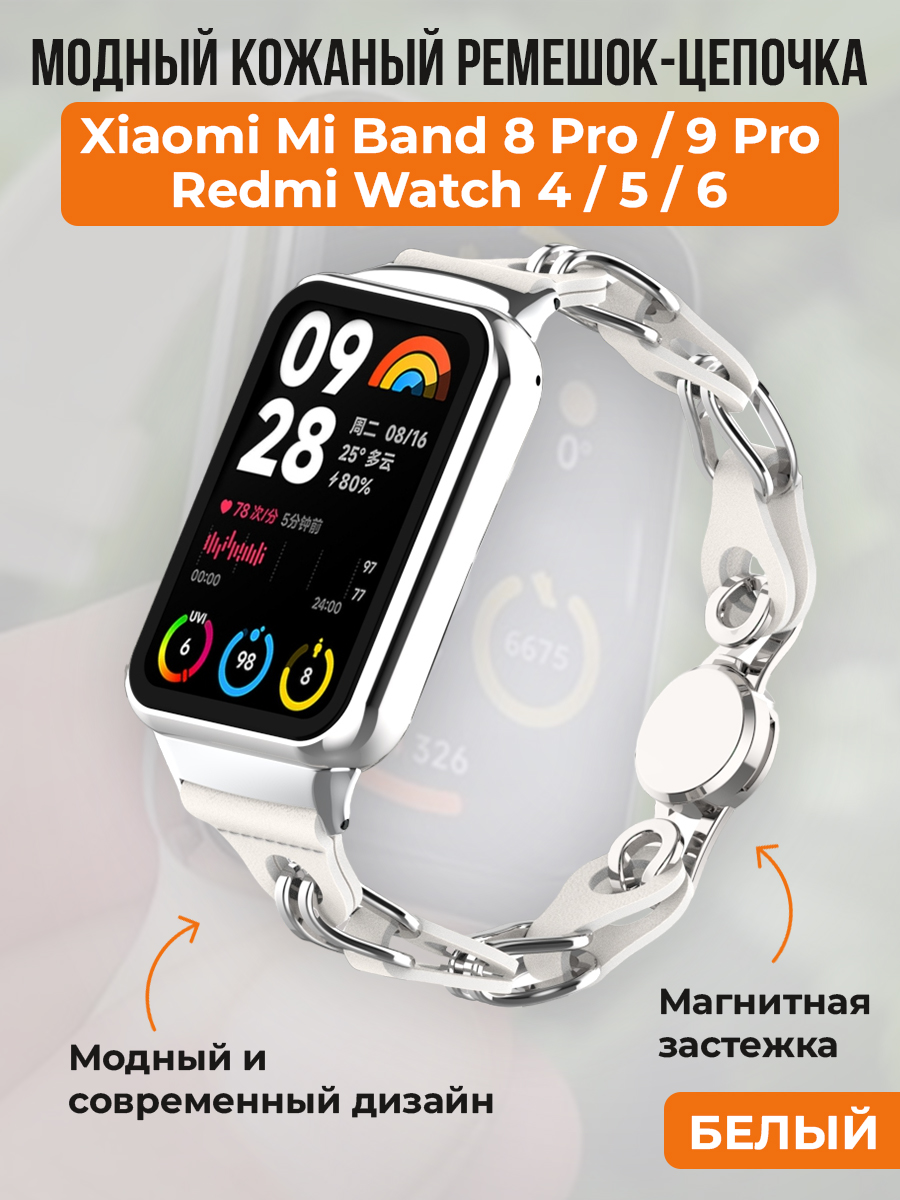 Модный кожаный ремешок цепочка для Xiaomi Mi Band 8 Pro/9 Pro и Redmi Watch 4/5/6, белый