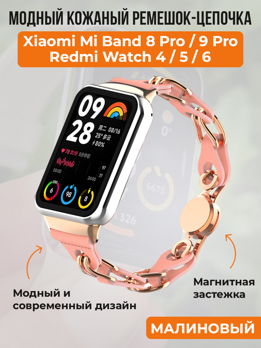 Модный кожаный ремешок цепочка для Xiaomi Mi Band 8 Pro/9 Pro и Redmi Watch 4/5/6, малиновый