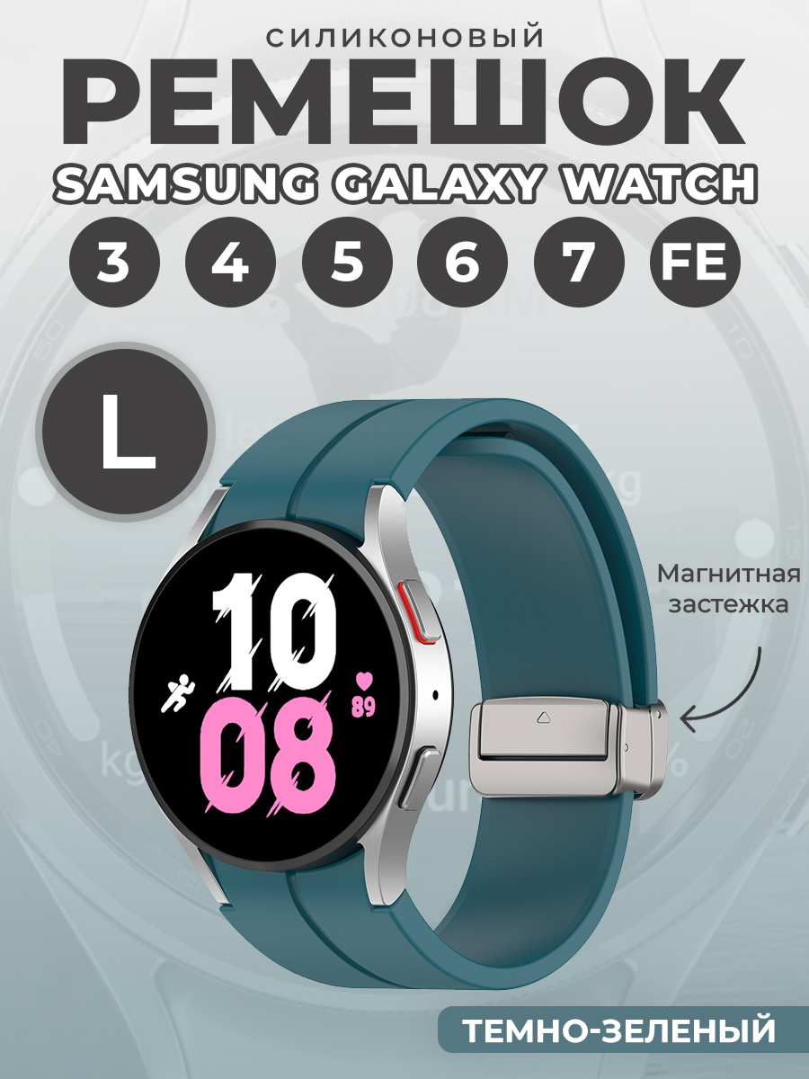 Силиконовый ремешок для Samsung Galaxy Watch 3/4/5/6/7/FE, L, серебристая застежка, темно-зеленый