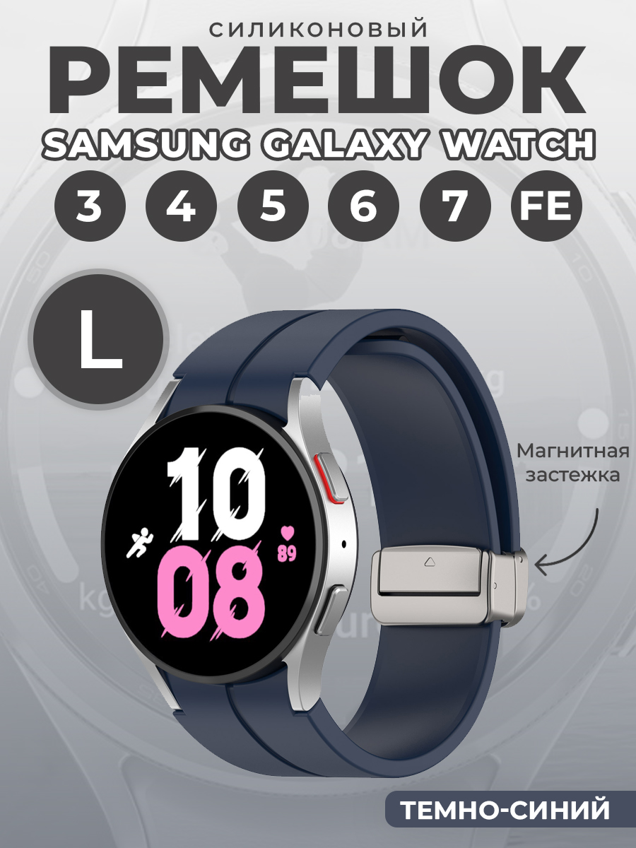 Силиконовый ремешок для Samsung Galaxy Watch 3/4/5/6/7/FE, L, серебристая застежка, темно-синий