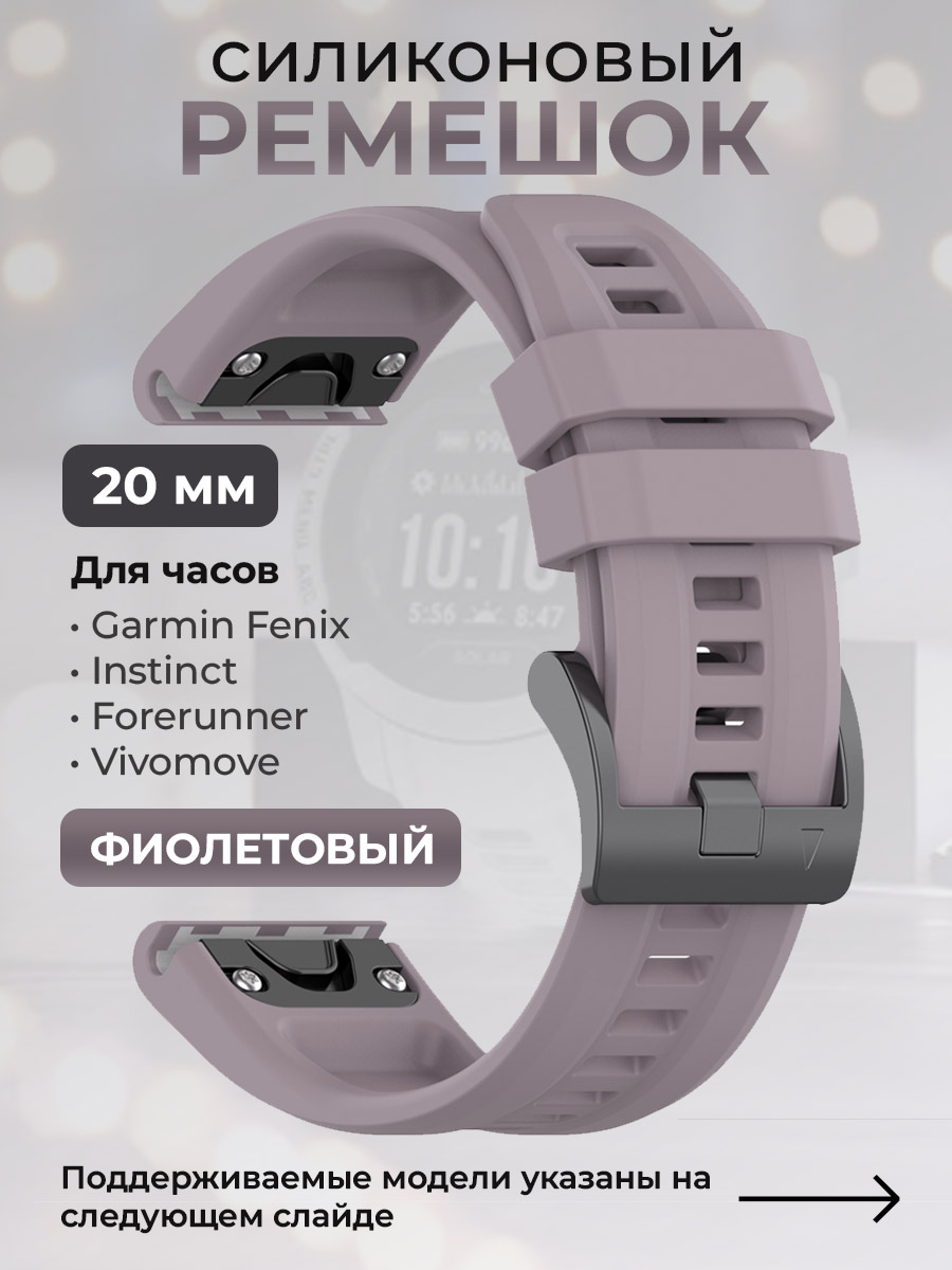 Силиконовый ремешок для Garmin Fenix / Instinct / Forerunner / Vivomove, 20 мм, c металлическим фиксатором и баклей, фиолетовый