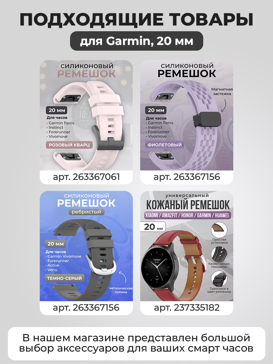 Однотонный ремешок Garmin предлагает разнообразные варианты ремешка в светлых тонах и ремешка в темных тонах, что позволяет настроить внешний вид ваших смарт-часов под ваш стиль и настроение.