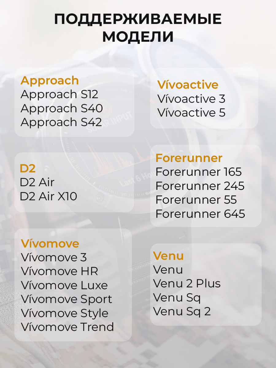 Совместимые модели: Approach S12, Approach S40, Approach S42, D2 Air, D2 Air X10, Forerunner 165, Forerunner 245, Forerunner 55, Forerunner 645, Venu, Venu 2 Plus, Venu Sq, Venu Sq 2, Vívoactive 3, Vívoactive 5, Vívomove 3, Vívomove HR, Vívomove Luxe, Vívomove Sport, Vívomove Style, Vívomove Trend.