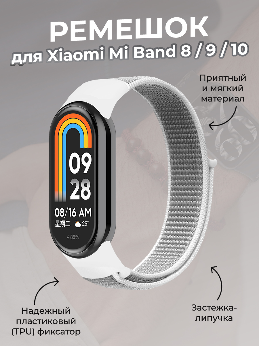 Ремешок с нейлоновой петлей на липучке для Xiaomi Mi Band 8/9/10, серо-белый