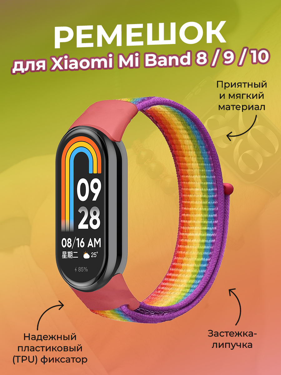 Ремешок с нейлоновой петлей на липучке для Xiaomi Mi Band 8/9/10, цвет радуги