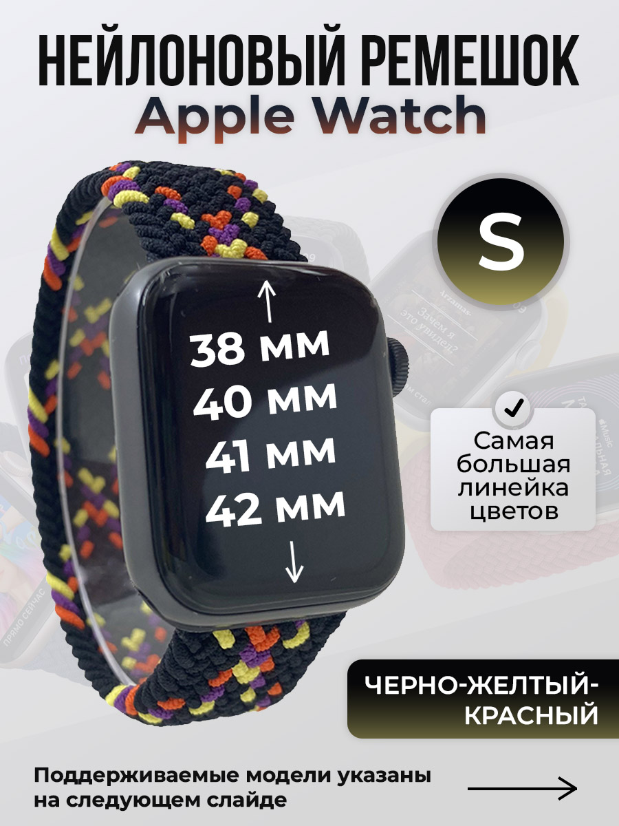 Нейлоновый ремешок для Apple Watch 1-9/SE/SE2/SE3 (38/40/41 мм), 10/11/S10/S11, 42 мм, без застежки, черно-желтый-красный, размер S