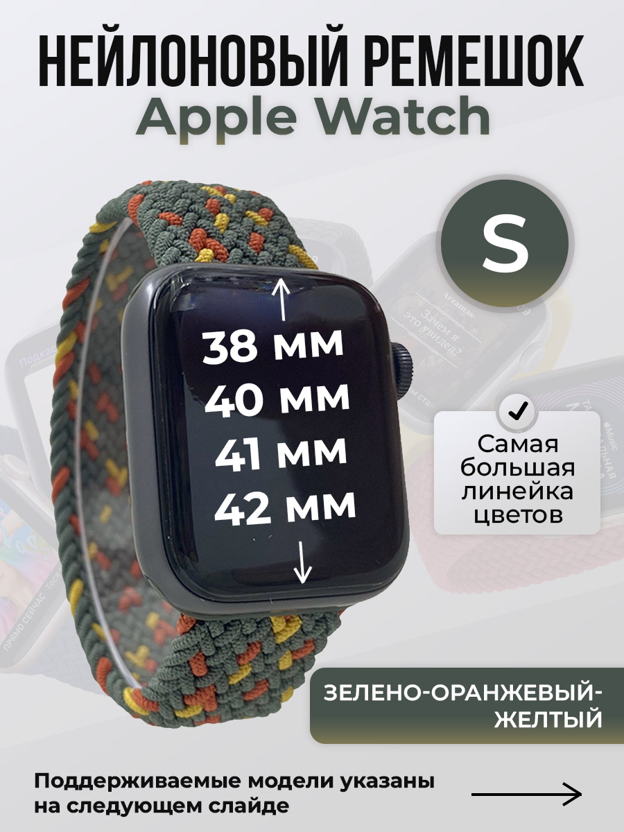 Нейлоновый ремешок для Apple Watch 1-9/SE/SE2/SE3 (38/40/41 мм), 10/11/S10/S11, 42 мм, без застежки, зелено-оранжевый-желтый, размер S