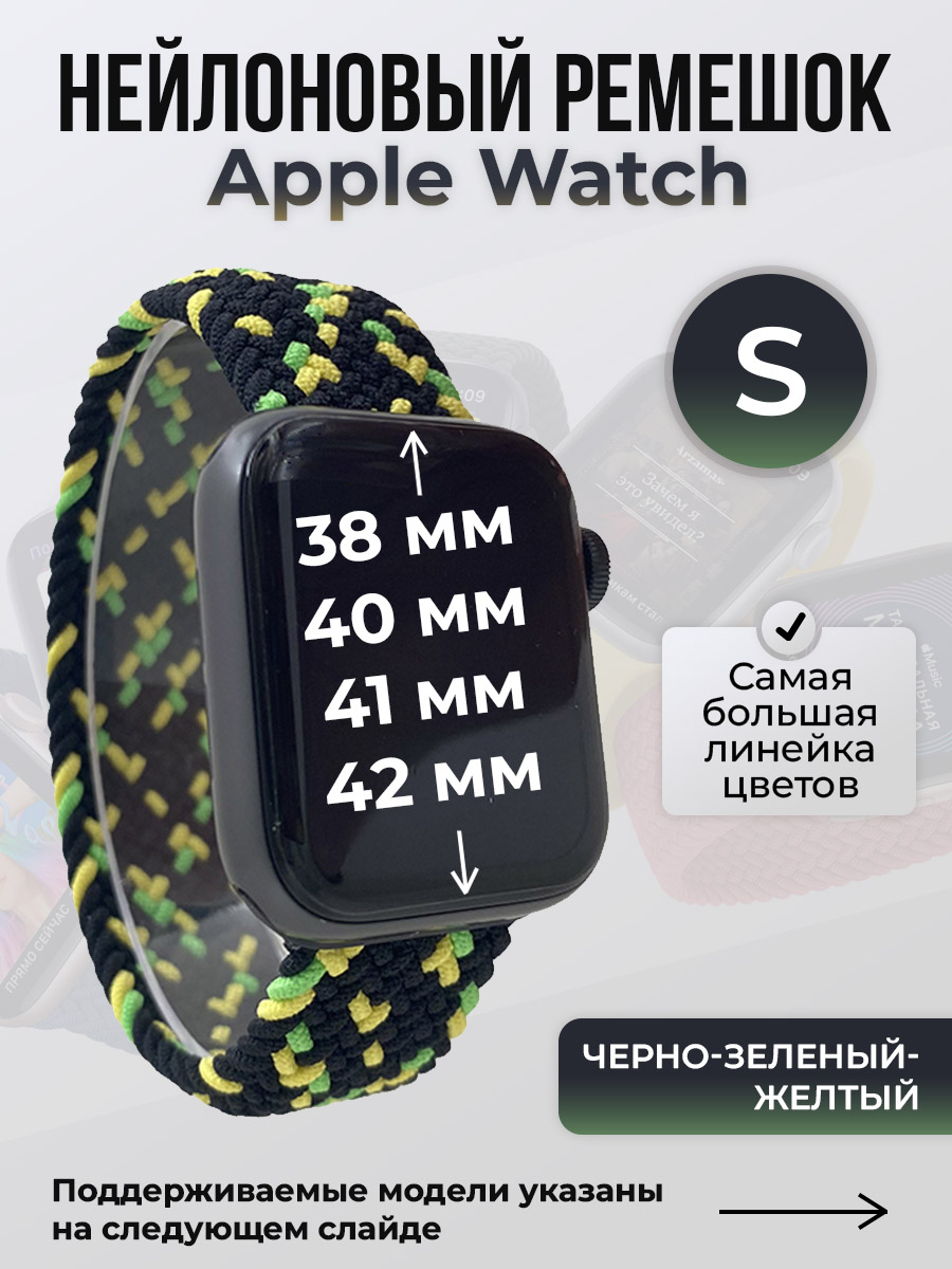Нейлоновый ремешок для Apple Watch 1-9/SE/SE2/SE3 (38/40/41 мм), 10/11/S10/S11, 42 мм, без застежки, черно-зеленый-желтый, размер S