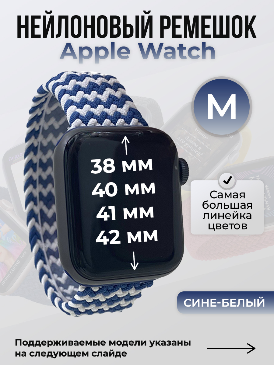 Нейлоновый ремешок для Apple Watch 1-9/SE/SE2/SE3 (38/40/41 мм), 10/11/S10/S11, 42 мм, без застежки, сине-белый, размер M