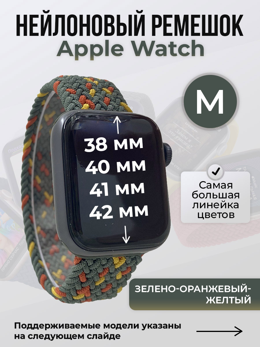 Нейлоновый ремешок для Apple Watch 1-9/SE/SE2/SE3 (38/40/41 мм), 10/11/S10/S11, 42 мм, без застежки, зелено-оранжевый-желтый, размер M