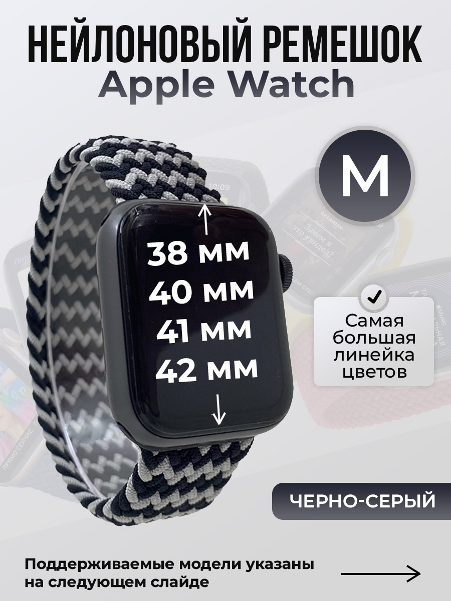 Нейлоновый ремешок для Apple Watch 1-9/SE/SE2/SE3 (38/40/41 мм), 10/11/S10/S11, 42 мм, без застежки, черно-серый, размер M