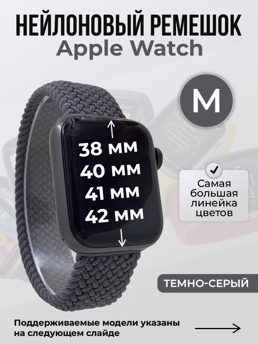 Нейлоновый ремешок для Apple Watch 1-9/SE/SE2/SE3 (38/40/41 мм), 10/11/S10/S11, 42 мм, без застежки, темно-серый, размер M
