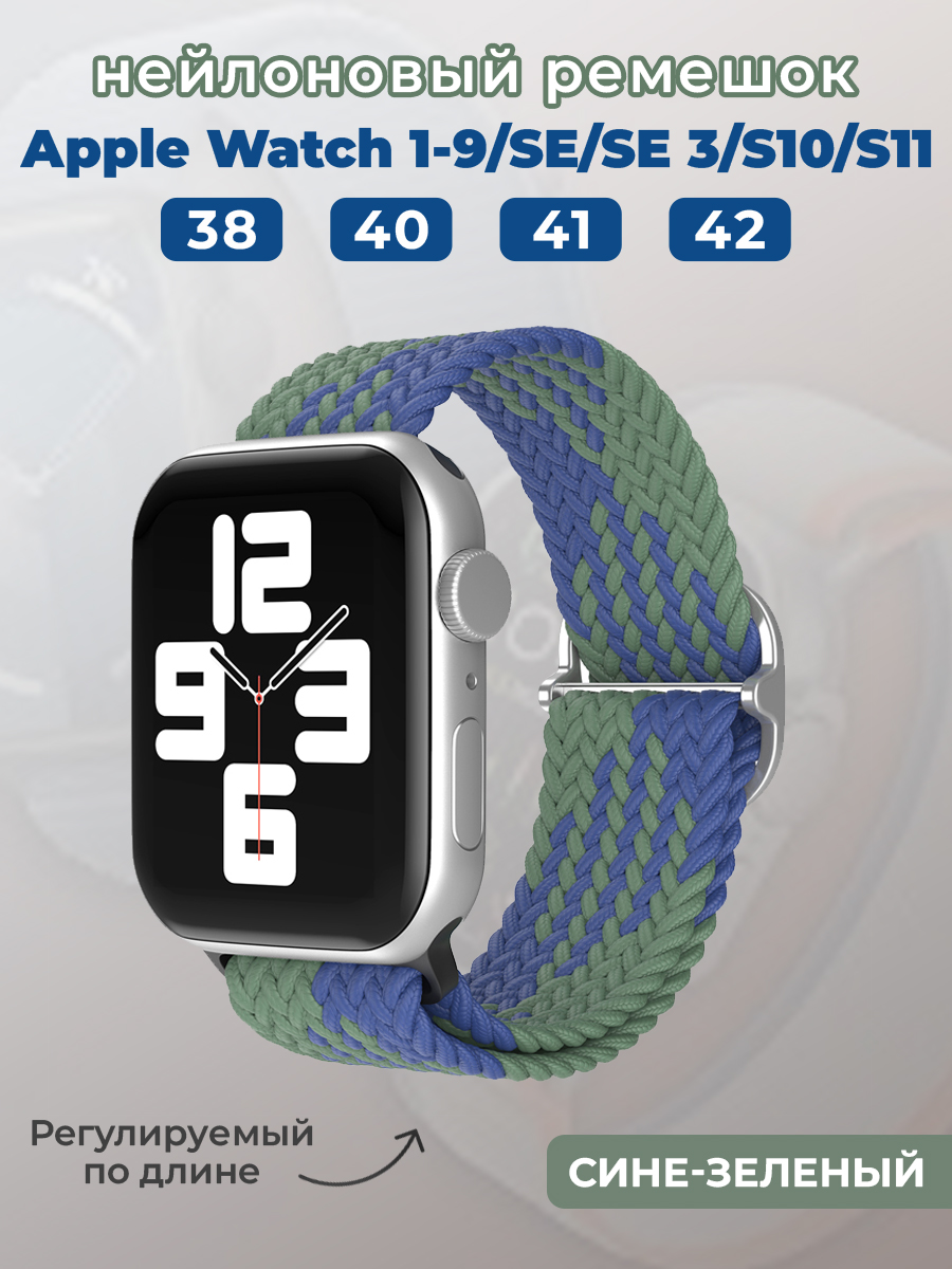 Нейлоновый ремешок для Apple Watch 1-9 / SE / SE 3 (38/40/41 мм), 11, S10/S11 42 мм, регулируемый по длине, сине-зеленый