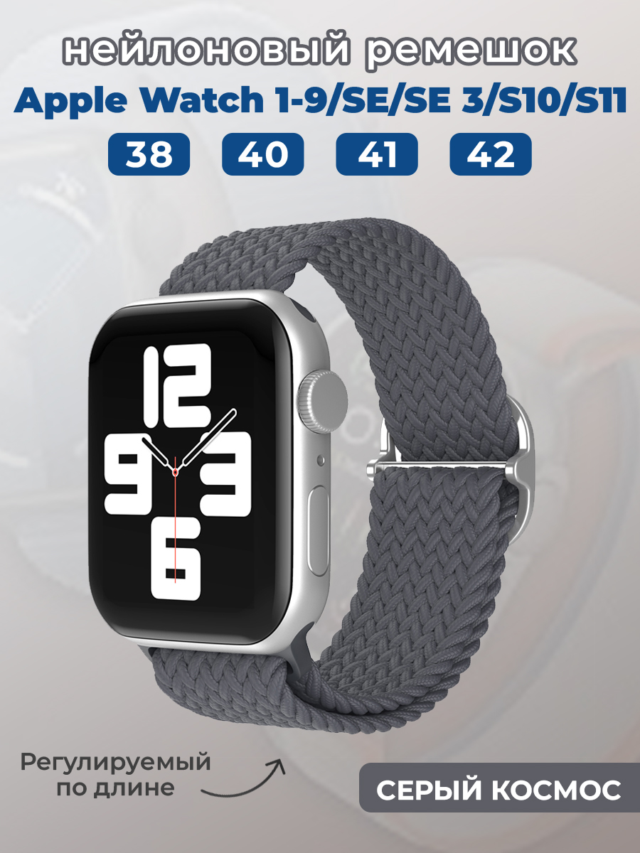 Нейлоновый ремешок для Apple Watch 1-9 / SE / SE 3 (38/40/41 мм), 11, S10/S11 42 мм, регулируемый по длине, серый космос